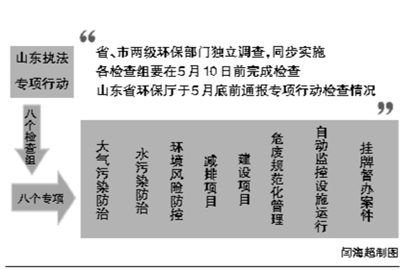 為有效整治違法排污企業(yè)、保障人民群眾健康,山東省政府決定自今年初至12月開(kāi)展全省范圍的環(huán)保大檢查。山東省環(huán)保廳于3月~5月組織開(kāi)展為期3個(gè)月的本年度 次環(huán)保專(zhuān)項行動(dòng)。