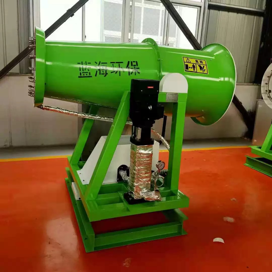 霧炮機是采用高壓水泵供水,通過(guò)水管將水送入噴霧機的噴頭處,由水泵產(chǎn)生的壓力在通過(guò) 制的噴頭將水產(chǎn)生顆粒較大的霧狀;然后由高速運轉的電動(dòng)機帶動(dòng)風(fēng)扇,產(chǎn)生高速流動(dòng)的氣流,將水霧送出去。將顆粒較大的水霧通過(guò)高速的氣流,進(jìn)一步撕裂成 細小 輕的水霧,并輸送出去。炮機種類(lèi)繁多、型號不同,然而每一個(gè)型號的霧炮機所具備的的功能型號也都不一樣。